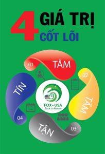 - Tâm: Fox-USA lấy chữ TÂM làm giá trị trường tồn trong mọi hoạt động sản xuất, kinh doanh. Chúng tôi đối xử công bằng và mang lại những giá trị lợi ích cao nhất cho khách hàng, đối tác, CBNV và các bên liên quan.