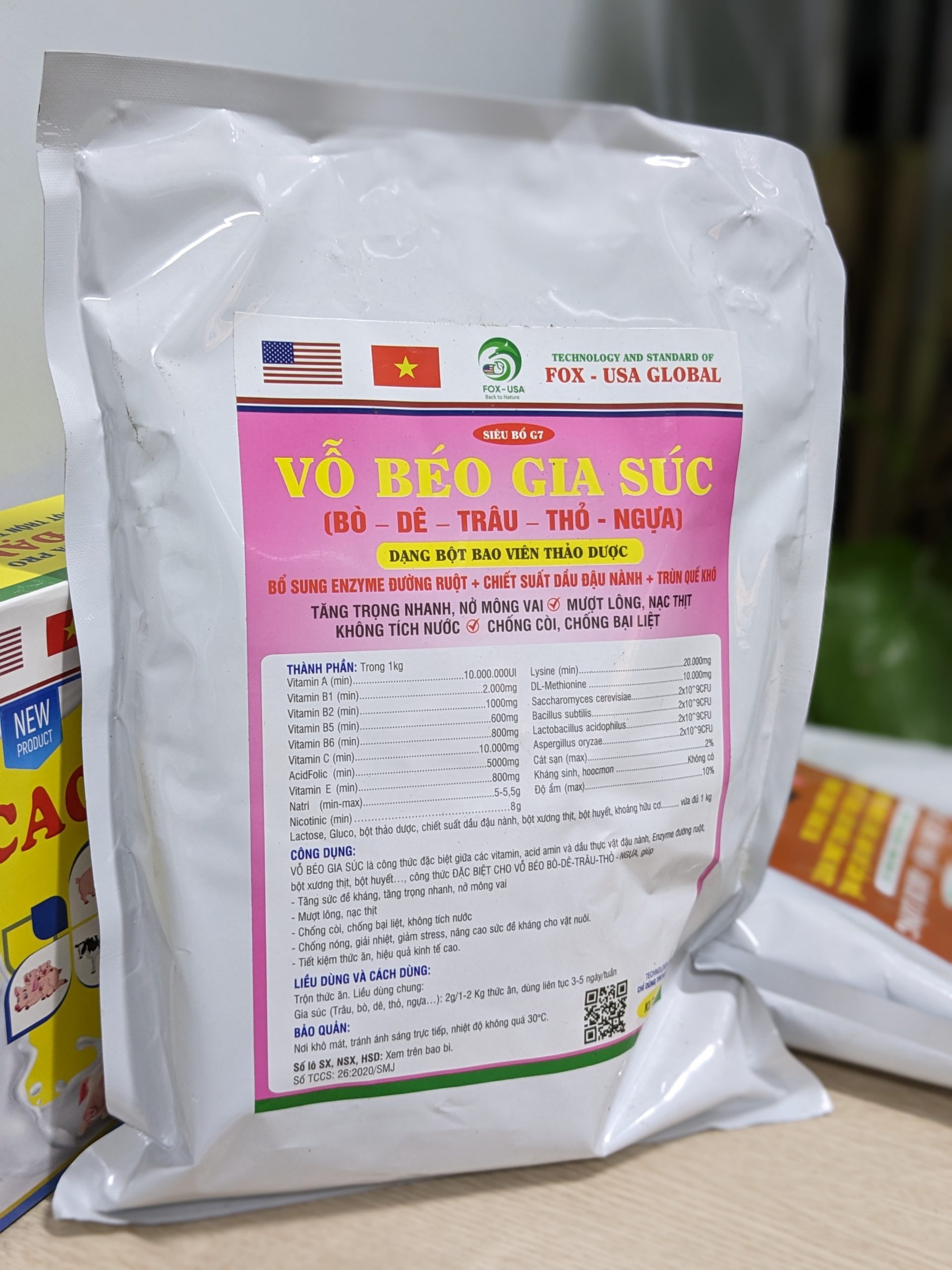 Vitamin A, Vitamin B1, Vitamin B2, Vitamin B5, Vitamin B6, Vitamin C, Acid Folic, Vitamin E, Natri, Nicotinic, Lysine, DL-Methionine, Saccharomyces cerevisiae, Bacillus subtilis, Lactobacillus acidophilus, Aspergillus oryzae, Cát sạn, Lactose, Glucose, bột thảo dược chiết suất dầu đậu nành, bột xương thịt, bột huyết, khoáng hữu cơ vừa đủ 1kg